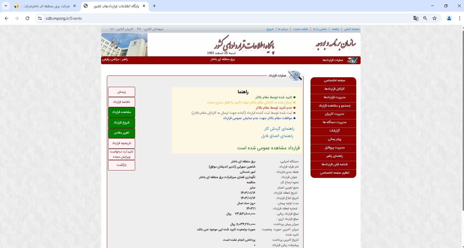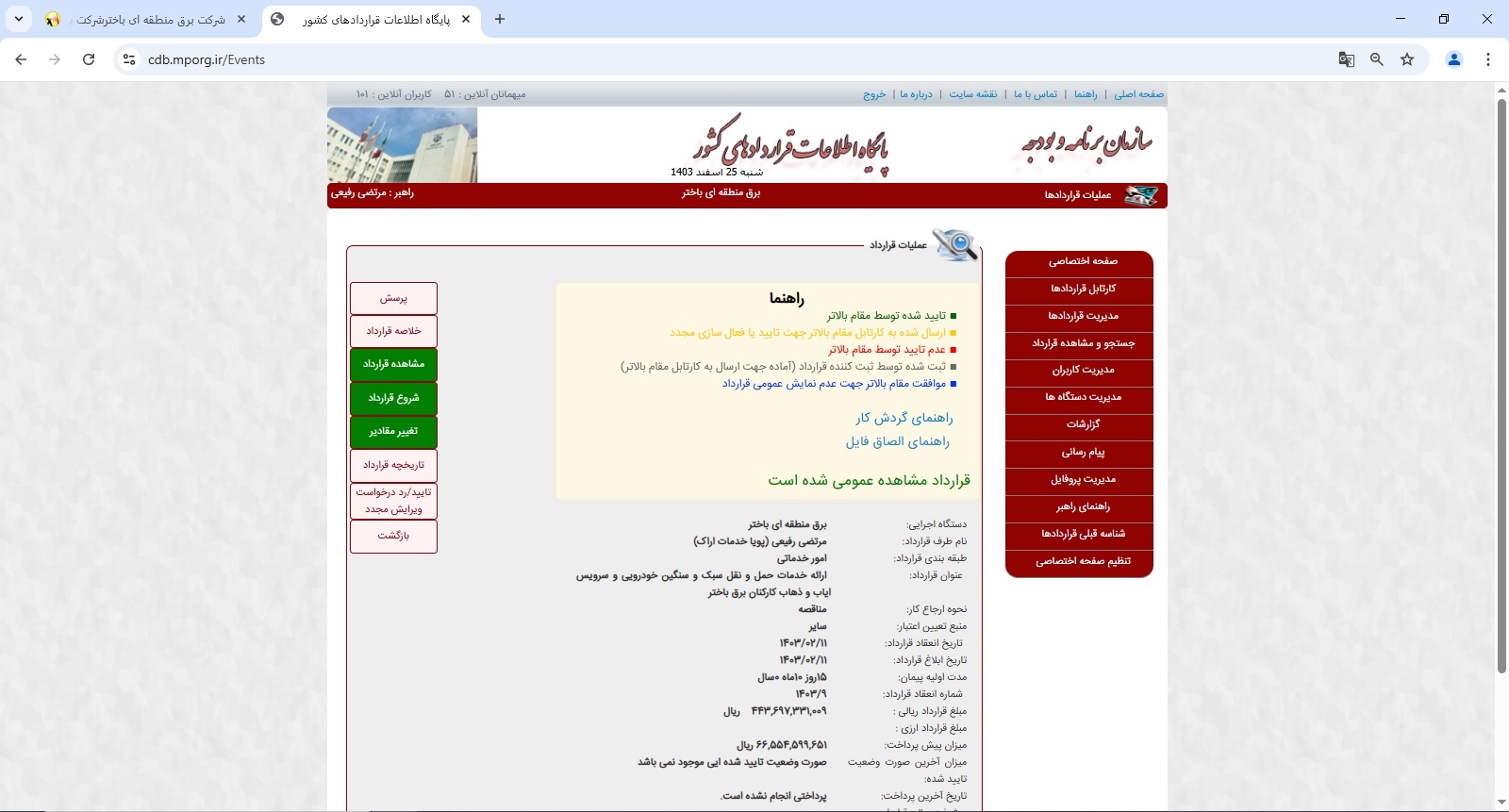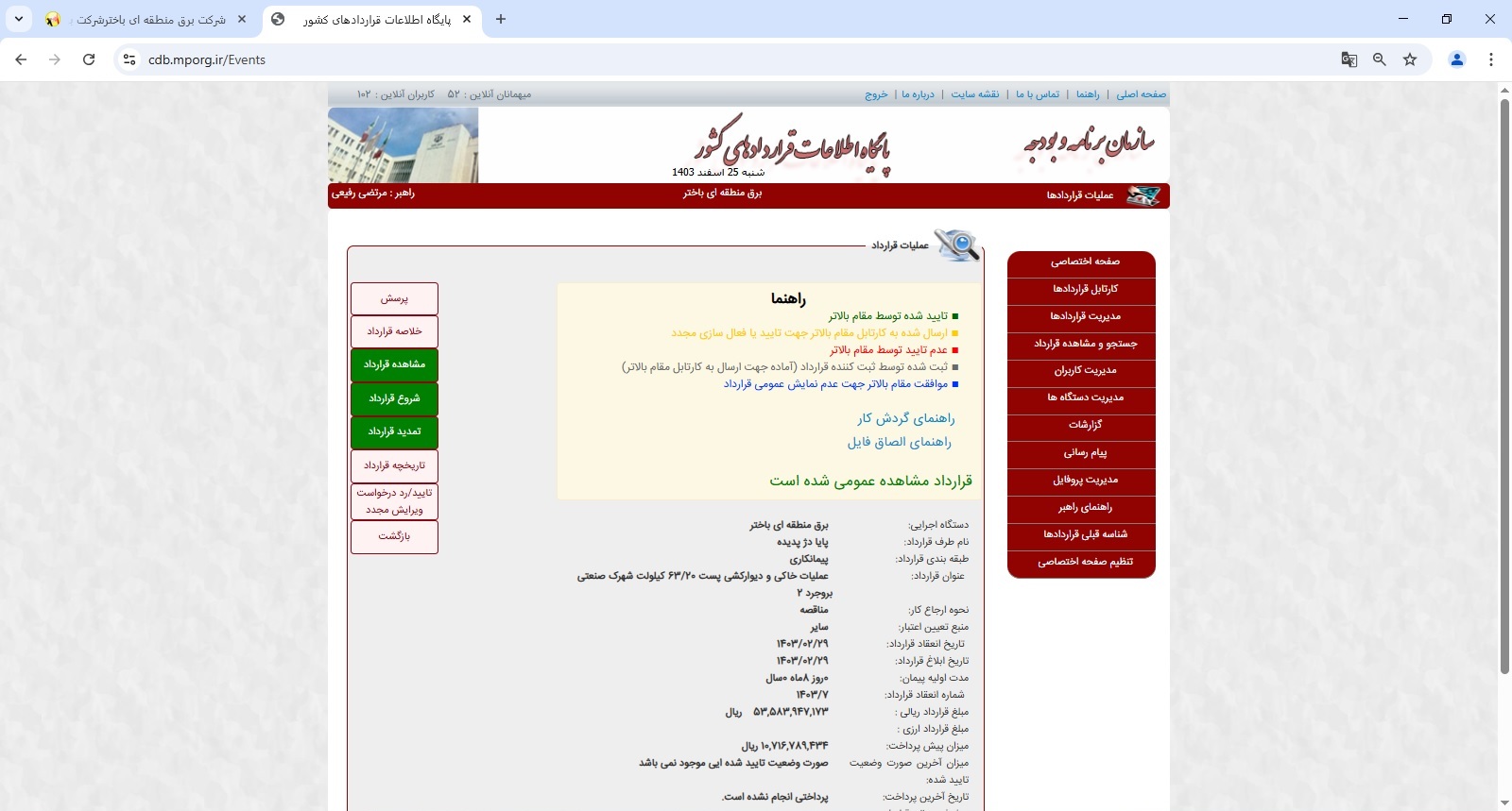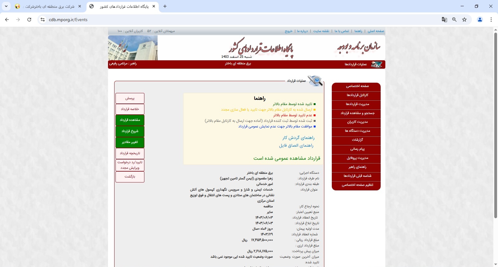 | ۰۳/۳۷ | شركت باختر توليد و انتقال نيروي برق (بتانير) | انجام خدمات نگهداري و تعميرات پستها ، خطوط انتقال فوق توزيع و سيستمهاي مخابرات و تله متري ديسپاچينگ فوق توزيع | ۱۴۰۳/۰۷/۰۱ | ۱۴۰۴/۰۵/۳۱ | ۱۴۰۴/۰۵/۳۱ | ۶۱,۶۸۷,۸۰۶,۹۸۶ | ۱,۷۴۹,۶۴۸,۶۲۲,۲۹۲ | لینک | لینک |